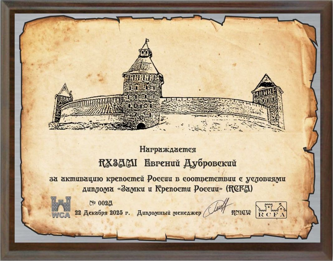 22 December 2025 - Evgeniy Dubrovskiy was awarded by RCFA HONOR ROLL PLATE № 002A for activations of Castles and Fortresses of Russia. Our congradulations ! 26 September 2025 - Andrey RN1CW, Kostya RA1L and Yuri RX4HJ are going to be active on the 27th of September from Yukansaari Island in Ladoga Lake, RRA: RR-10-20 (new one), Lighthouse Yukansaari, RLHA: (new one), RDA: KL-13. They plan to work on 10, 12, 17, 20 and 30 meters CW and SSB as RN1CW/p, RA1L/p and RX4HJ/1. 30 Àâãóñòà 2025 - Andrey RN1CW is going to be active on the 31st of August from Yukansaari Island in Ladoga Lake, RRA: RR-10-20 (new one), Lighthouse Yukansaari, RLHA: (new one), RDA: KL-13. He plans to work on 40 and 20 meters CW and SSB as RN1CW/p. 29 August 2025 - Andrey RN1CW and Kostya RA1L are going to be active on the 30th August from Verkkosaari Island in Ladoga Lake, RRA: RR-19-20, RDA: KL-13. They plan to work on 40 and 20 meters CW and SSB as RN1CW/p and RA1L/p. 13 June 2025 - Andrey RN1CW is going to be active on the 14th of June from Lakhdenpohja district of Karelia, RDA: KL-13. He plans to work on 20 meters mainly CW as RN1CW/p. 7 May 2025 - We congradulate all radiohams on the Radio Day and the Victory Day! 4 May 2025 - Sergey Belyaev RD3DM was awarded by RCFA HONOR ROLL PLATE № 002 for QSO with Castles and Fortresses of Russia. Our congradulations ! 6 May 2024 - We congradulate all radiohams on the upcoming Radio Day and the Victory Day! 5 May 2023 - We congradulate all radiohams on the upcoming Radio Day and the Victory Day! 16 December 2022 - Valery Bogomolov was awarded by RCFA HONOR ROLL PLATE № 001A for activations of Castles and Fortresses of Russia. Our congradulations ! 11 June 2022 - Victor R1CBN and Vladimir UA1CIO will be active on the 11th of June by special call RC20LH from Lighthouse Krasnaya Gorka (RLHA: RLE-016, ARLHS: ERU-141), Fort Krasnaya Gorka, WCA / RCFA: UA / RCF-00203 and RDA: LO-30. They plan to work from 10 to 14 UTC on all bands CW, SSB and Digital. 9 June 2022 - Roberto Gadler IN3NJB was awarded by RCFA HONOR ROLL PLATE № 001 for QSO with Castles and Fortresses of Russia. Our congradulations ! 6 May 2022 - We congradulate all radiohams on the upcoming Radio Day and the Victory Day! 23 January 2022 - Andrey RN1CW will be active on the 23rd of January from Fortress Oreshek, WCA / RCFA: UA / RCF-00014, RDA: LO-28. He plans to work from 8 to 10 UTC on 40, 30 and 20 meters CW and SSB as RN1CW/m. 15 January 2022 - Victor R1CBN and Vladimir UA1CIO will take part in WCA Happy BirthDay (WCA HBD) and will be active on the 15th of January from Fort Krasnaya Gorka, WCA / RCFA: UA / RCF-00203, RDA: LO-30. They going to work beginning from 08:30 UTC on all bands CW, SSB and FT8 as R1CBN and UA1CIO/p. 11 January 2022 - From January 11, 2022, the award program “Castles On The Air - Russia” (COTA-RU) changes its name to “Russian Castles and Fortresses” Award (RCFA). The object numbers of the "Russian Castles and Fortresses" Award (RCFA) program are changed in accordance with the numbering of the objects of World Castles Award (WCA) program. 9 August 2021 - Francois Gorremans ON5SWA was awarded by WCA HONOR ROLL № 013 for QSO with Fortresses of the World. Our congradulations ! 9 August 2021 - Danny Van Tricht ON4VT was awarded by WCA HONOR ROLL № 012 for QSO with Fortresses of the World. Our congradulations ! 9 August 2021 - Karl Dorner DL1JKK was awarded by WCA HONOR ROLL № 011 for QSO with Fortresses of the World. Our congradulations ! 9 June 2021 - Andrey RN1CW will active on the 9th of June from Feodorovsky Gorodok, WCA: UA-00315, COTA-RU: C-134, RDA: SP-18. He going to work from 14:30 to 16 UTC on 20, 30 and 40 meters mainly CW as RN1CW/m. 21 May 2021 - Andrey RN1CW will active on the 21rd of May from Leningradsky (79-th) fortified area, WCA: UA-00304, COTA-RU: U-114, RDA: SP-19. He going to work from 5 to 7 UTC on 20, 30 and 40 meters mainly CW as RN1CW/m. 7 May 2021 - Andrey RN1CW will active on the 7th of May from Peterstadt Fortress, WCA: UA-00028, COTA-RU: C-128, RDA: SP-11. He going to work from 6 to 8 UTC on 20, 30 and 40 meters mainly CW as RN1CW/m. 6 May 2021 - We congradulate all radiohams on the upcoming Radio Day and the Victory Day! 29 April 2021 - Andrey RN1CW will active on the 29th of April from Pervy Severny Fort in Kronshdad WCA: UA-00195, COTA-RU: F-101, RDA: SP-09, Kotlin Island IOTA: EU-133, RRA: RR-01-09. He going to work from 14 to 16 UTC on 20, 30 and 40 meters mainly CW as RN1CW/m. 12 April 2021 - Andrey RN1CW will active on the 12th of April from Karelsky fortified, WCA: UA-00255, COTA-RU: U-101, RDA: SP-10 and Mannerheim’s Line, WCA: UA-00543, COTA-RU: U-119, RDA: LO-24. He going to work from 14 to 16:30 UTC on 20, 30 and 40 meters mainly CW as RN1CW/m. 31 March 2021 - Andrey RN1CW will active on the 31st of March from Fort Konstantin, WCA: UA-00202, COTA-RU: F-108 located on Kotlin Island, IOTA: EU-133, RRA: RR-01-06, RDA: SP-09. He going to work from 13:30 to 15 UTC on 40, 30 and 20 meters mainly CW as RN1CW/m. 20 March 2021 - Andrey RN1CW will active on the 20th of March from Izhora earthen stronghold, WCA: UA-00677, COTA-RU: R-138, RDA: SP-06. He going to work from 05:50 to 8 UTC on 40, 30 and 20 meters mainly CW as RN1CW/m. 6 March 2021 - Andrey RN1CW will active on the 6th of March from Osinovetsky Redoubt, WCA: UA-00407, COTA-RU: R-122, RDA: SP-03. He going to work from 6 to 8 UTC on 40, 30 and 20 meters mainly CW as RN1CW/m. 27 February 2021 - Andrey RN1CW will active on the 27th of February from Fortified wall of Fedorovsky Cathedral of St.Petersburg, WCA: UA-00690, COTA-RU: C-148, RDA: SP-20. He going to work from 6 to 8 UTC on 40, 30 and 20 meters mainly CW as RN1CW/m. 30 January 2021 - Andrey RN1CW will active on the 30th of January from Krasny Castle, WCA: UA-00550, COTA-RU: C-144, RDA: LO-23. He going to work from 6 to 9 UTC on all bands CW and SSB as RN1CW/m. 22 January 2021 - Andrey RN1CW will active on the 23rd of Jan