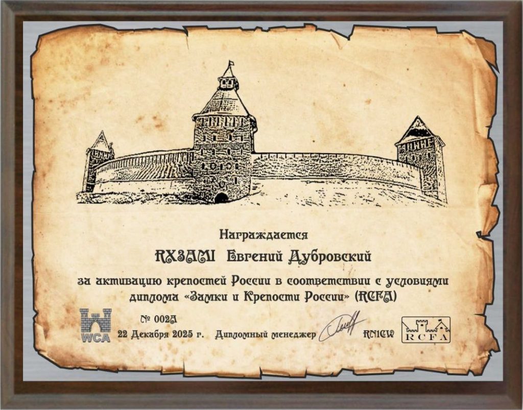 30 Января 2026 - Виктор R1CBN, Андрей RN1CW и Владимир UA1CIO будут активны 31 января с Форта Красная Горка, WCA / RCFA: UA / RCF-00203, RDA: LO-30. Работа планируется с 7 до 11 UTC на 40 и 20 метрах CW и SSB позывными R1CBN, RN1CW/p и UA1CIO/p. 12 декабря 2025 - Евгений Дубровский награждён Доской-наградой RCFA HONOR ROLL PLATE № 002A за активацию замков и крепостей России. Поздравляем ! 26 Сентября 2025 - Андрей RN1CW, Костя RA1L и Юрий RX4HJ будут активны 27 сентября с острова Юкансари, RRA: RR-10-20 (new one), маяк Юкансари, RLHA: (new one), RDA: KL-13. Работа планируется на 10, 12, 17, 20 и 30 метрах CW и SSB позывными RN1CW/p, RA1L/p и RX4HJ/1. 30 Августа 2025 - Андрей RN1CW будет активен 31 августа с острова Юкансари, RRA: RR-10-20 (new one), маяк Юкансари, RLHA: (new one), RDA: KL-13. Работа планируется на 40 и 20 метрах CW и SSB позывным RN1CW/p. 29 Августа 2025 - Андрей RN1CW и Костя RA1L будут активны 30 августа с острова Верккосаари, RRA: RR-19-20, RDA: KL-13. Работа планируется на 40 и 20 метрах CW и SSB позывными RN1CW/p и RA1L/p. 13 Июня 2025 - Андрей RN1CW будет активен 14 июня с Лахденпохьского района Карелии, RDA: KL-13. Работа планируется на 20 метрах в основном CW позывным RN1CW/p. 7 Мая 2025 - Поздравляем всех радиолюбителей с праздниками - Днём Радио и Днём Победы! 4 Мая 2025 - Сергей Беляев RD3DM награждён Доской-наградой RCFA HONOR ROLL PLATE № 002 за проведение связей с замками и крепостями России. Поздравляем ! 6 Мая 2024 - Поздравляем всех радиолюбителей с наступающими праздниками - Днём Радио и Днём Победы! 5 Мая 2023 - Поздравляем всех радиолюбителей с наступающими праздниками - Днём Радио и Днём Победы! 16 декабря 2022 - Валерий Богомолов награждён Доской-наградой RCFA HONOR ROLL PLATE № 001A за активацию замков и крепостей России. Поздравляем ! 11 Июня 2022 - Виктор R1CBN и Владимир UA1CIO будут активны 11 июня специальным позывным RC20LH с маяка Красная Горка (RLHA: RLE-016, ARLHS: ERU-141), Форт Красная Горка, WCA / RCFA: UA / RCF-00203 и RDA: LO-30. Работа планируется на всех диапазонах CW, SSB и Digital с 10 до 14 UTC. 9 Июня 2022 - Роберто Гадлер IN3NJB награждён Доской-наградой RCFA HONOR ROLL PLATE № 001 за проведение связей с замками и крепостями России. Поздравляем ! 6 Мая 2022 - Поздравляем всех радиолюбителей с наступающими праздниками - Днём Радио и Днём Победы! 23 Января 2022 - Андрей RN1CW будет активен 23 января с крепости Орешек, WCA / RCFA: UA / RCF-00014, RDA: LO-28. Работа планируется с 8 до 10 UTC на 40, 30 и 20 метрах CW и SSB позывным RN1CW/m. 15 Января 2022 - Виктор R1CBN и Владимир UA1CIO будут участвовать в днях активности радиолюбителей с замков и крепостей мира - WCA Happy BirthDay (WCA HBD) и будут активны 15 января с Форта Красная Горка, WCA / RCFA: UA / RCF-00203, RDA: LO-30. Работа планируется с 08:30 UTC на всех диапазонах CW, SSB и FT8 позывными R1CBN и UA1CIO/p. 11 Января 2022 - С 11 января 2022 года дипломная программа «В эфире крепости России» (COTA-RU) меняет своё название на «Замки и крепости России» (RCFA). Номера объектов дипломной программы «Замки и крепости России» (RCFA) изменяются в соответствии с нумерацией объектов дипломной программы «Крепости мира» (WCA). Условия и дизайн дипломов, доски-награды и плакеток программы остаются те же (кроме названия). 9 Августа 2021 - Франсуа Горреман ON5SWA награждён плакеткой WCA HONOR ROLL № 013 за работу с крепостями мира. Поздравляем ! 9 Августа 2021 - Дэнни Ван Трихт ON4VT награждён плакеткой WCA HONOR ROLL № 012 за работу с крепостями мира. Поздравляем ! 9 Августа 2021 - Карл Дорнер DL1JKK награждён плакеткой WCA HONOR ROLL № 011 за работу с крепостями мира. Поздравляем ! 9 Июня 2021 - Андрей RN1CW будет активен 9 июня с Фёдоровского городка, WCA: UA-00315, COTA-RU: C-134, RDA: SP-18. Работа планируется на 20, 30 и 40 метрах в основном CW позывным RN1CW/m с